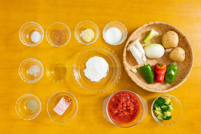 厚手鍋にオリーブオイルを温めてにんにくを炒め、玉ねぎ・ベーコン・セロリ・エリンギ・ピーマンを炒める。