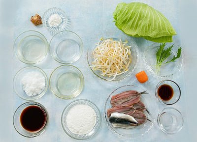 ・イワシは頭と内臓を取り除き、手開きにして骨を取り除いて下味Ⓐをつける。