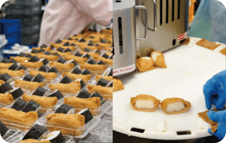 最新の小型いなり寿司機を採用。専用パーツの交換で、俵(8×6cm、8×4cm)と三角いなりのご要望にお応えします。