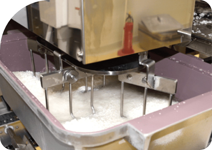 洗米後のお米を浸漬・水切りし、炊飯釜への充填・注水作業も全自動で行ないます。