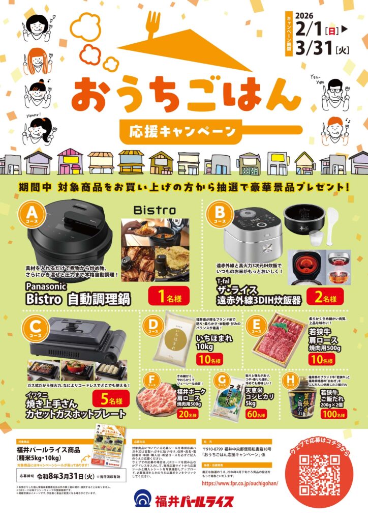 2026年2月1日〜3月31日の2ヶ月間、福井パールライスの対象商品をご購入いただき応募いただくと、